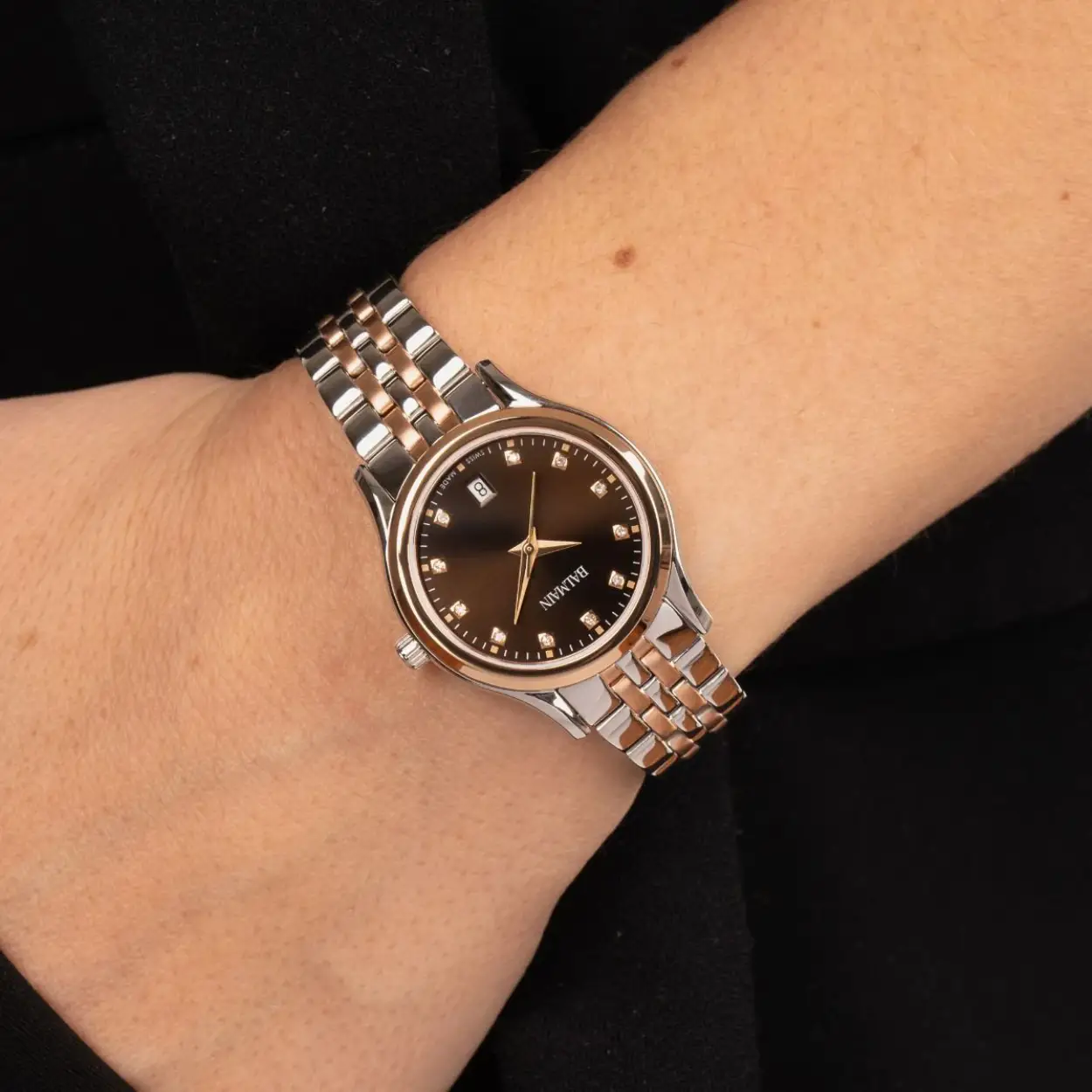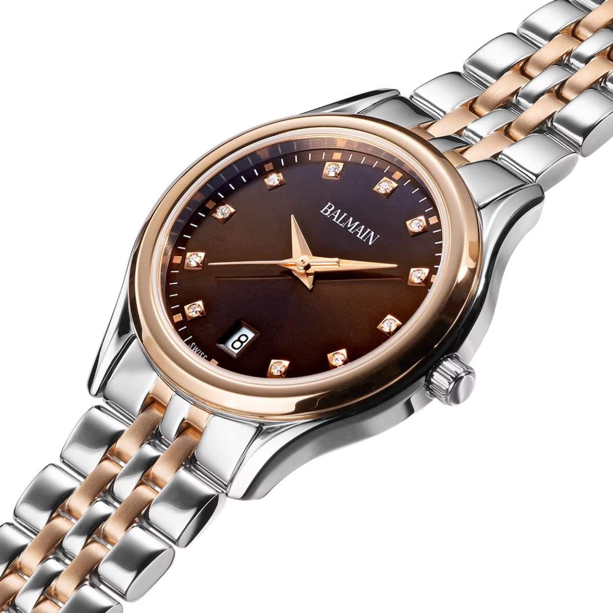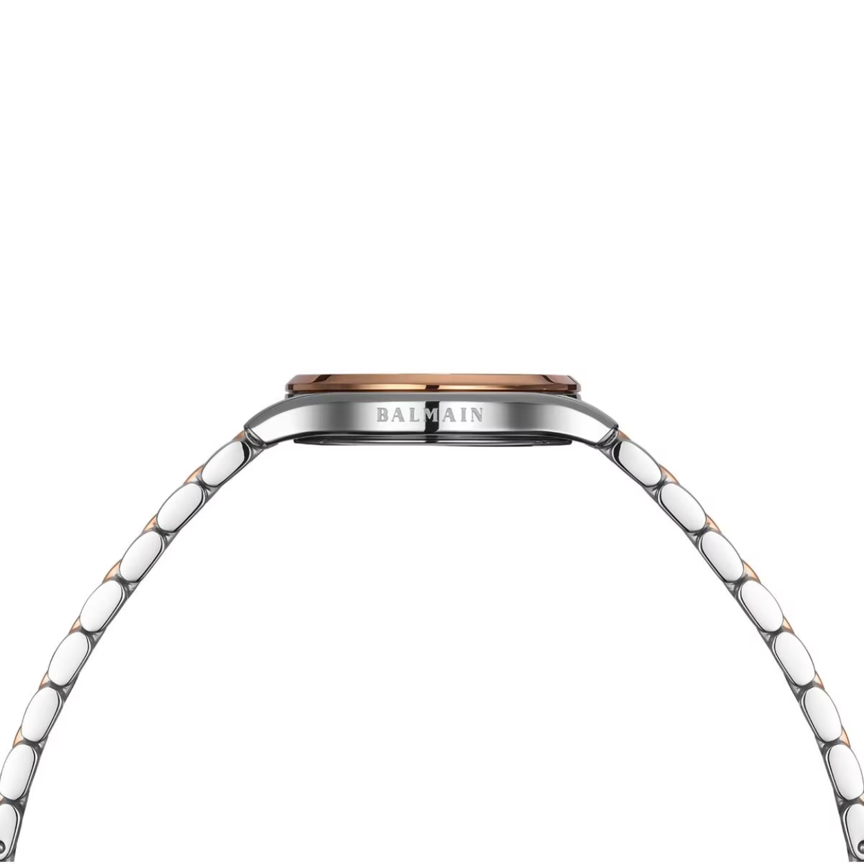 Dit verfijnde dameshorloge heeft een bruine wijzerplaat met diamanten index (0,041crt). Naast de tijd is op de wijzerplaat ook een datumaanduiding te zien. De kast en bijpassende horlogeband zijn vervaardigd van edelstaal. De B8348.33.55 is uitgerust met een quartz uurwerk, heeft een krasarm saffierglas en is tot 30 meter waterdicht. De horlogekast heeft een diameter van 28 mm. Dankzij de verfijnde en luxe details is dit Balmain horloge B83483355 uit de Beleganza Mini serie echt een plaatje om de pols.