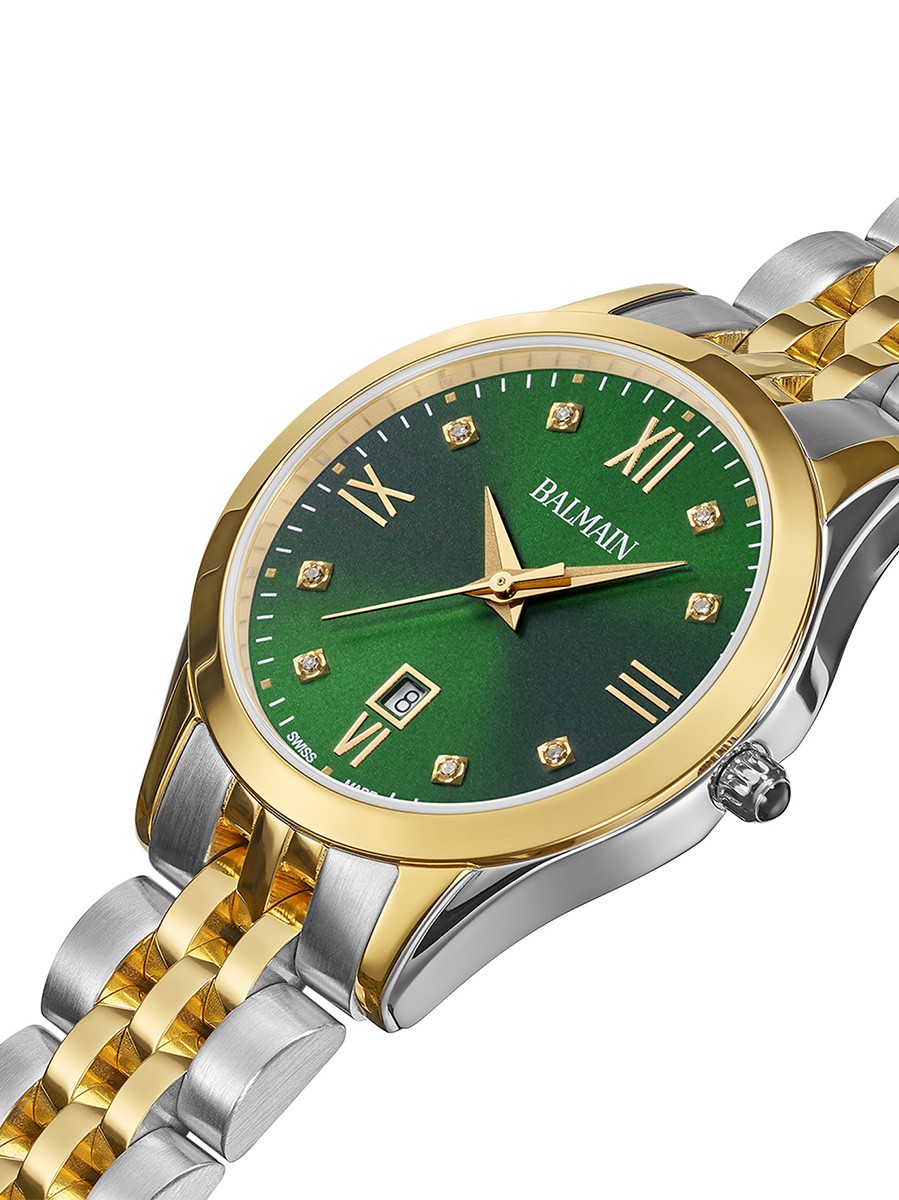 Dit bicolor dameshorloge heeft een prachtig groene wijzerplaat, waarop naast de tijd ook de datum is af te lezen. De wijzerplaat is versierd met diamanten, wat het model extra chique maakt. De kast (30mm) en schakelband van het horloge zijn gemaakt van gold-plated edelstaal. De B41123175 is luxe afgewerkt met een krasarm saffierglas en een waterdichtheid tot 50 meter. Dit houdt in dat het horloge zonder problemen omgelaten kan worden tijdens het douchen of zwemmen (duiken uitgezonderd). De saffier in de kroon maakt de luxe uitstraling compleet! Dit horloge uit de Balmain Classic R serie straalt klasse en elegantie uit.