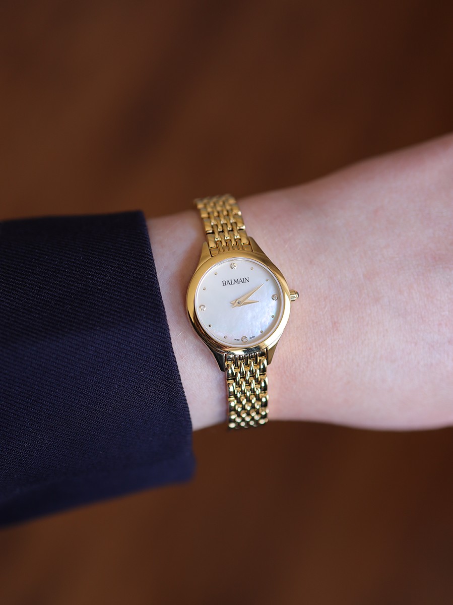 Dit Balmain dameshorloge heeft een sierlijke parelmoer wijzerplaat met diamanten index (0,015crt). De horlogekast (25mm) en schakelband van het horloge zijn vervaardigd van edelstaal. Bovendien zijn de bezel en horlogeband voorzien van een geelgouden PVD laag. De B4930.33.85 is voorzien van een quartz uurwerk, een krasarm saffierglas en is tot 50 meter waterdicht. Dit houdt in dat het horloge zonder problemen omgelaten kan worden tijdens het douchen of zwemmen (duiken uitgezonderd). Dit horloge uit de Balmain de Balmain serie is een charmant en draagbaar dameshorloge.