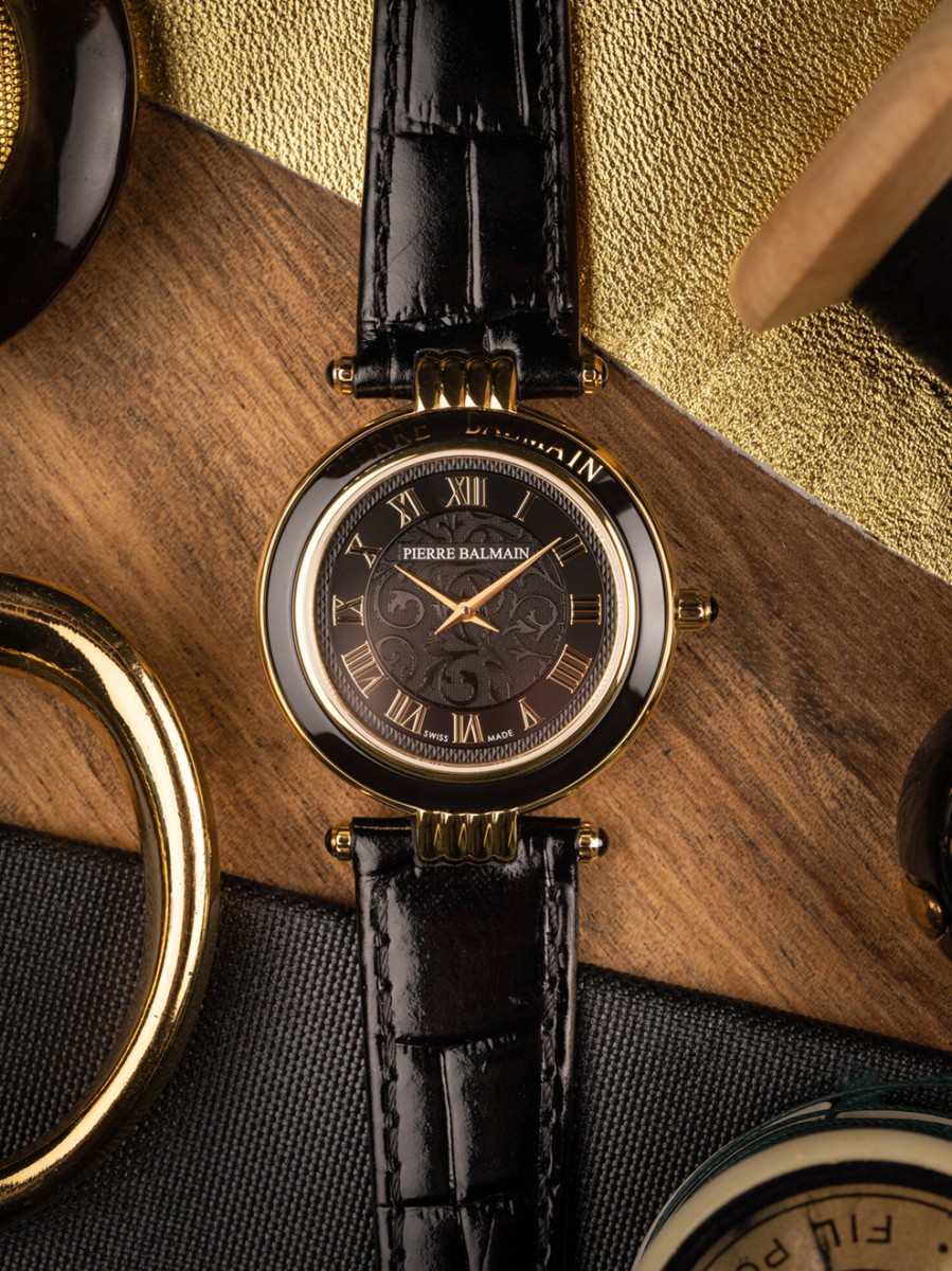 Dit verfijnde dameshorloge heeft een donkere wijzerplaat met goudkleurige wijzers, Romeinse index en een sierlijke arabesque patroon. De kast van het horloge is vervaardigd van edelstaal. De B8137.32.12 is uitgerust met een quartz uurwerk, heeft een krasarm saffierglas en is tot 30 meter waterdicht. De band van het model is gemaakt van zwart leer en is voorzien van een gespsluiting. Dankzij de verfijnde en luxe details is dit Balmain horloge B81373212 uit de Beleganza Haute Elegance Vintage serie echt een plaatje om de pols.
