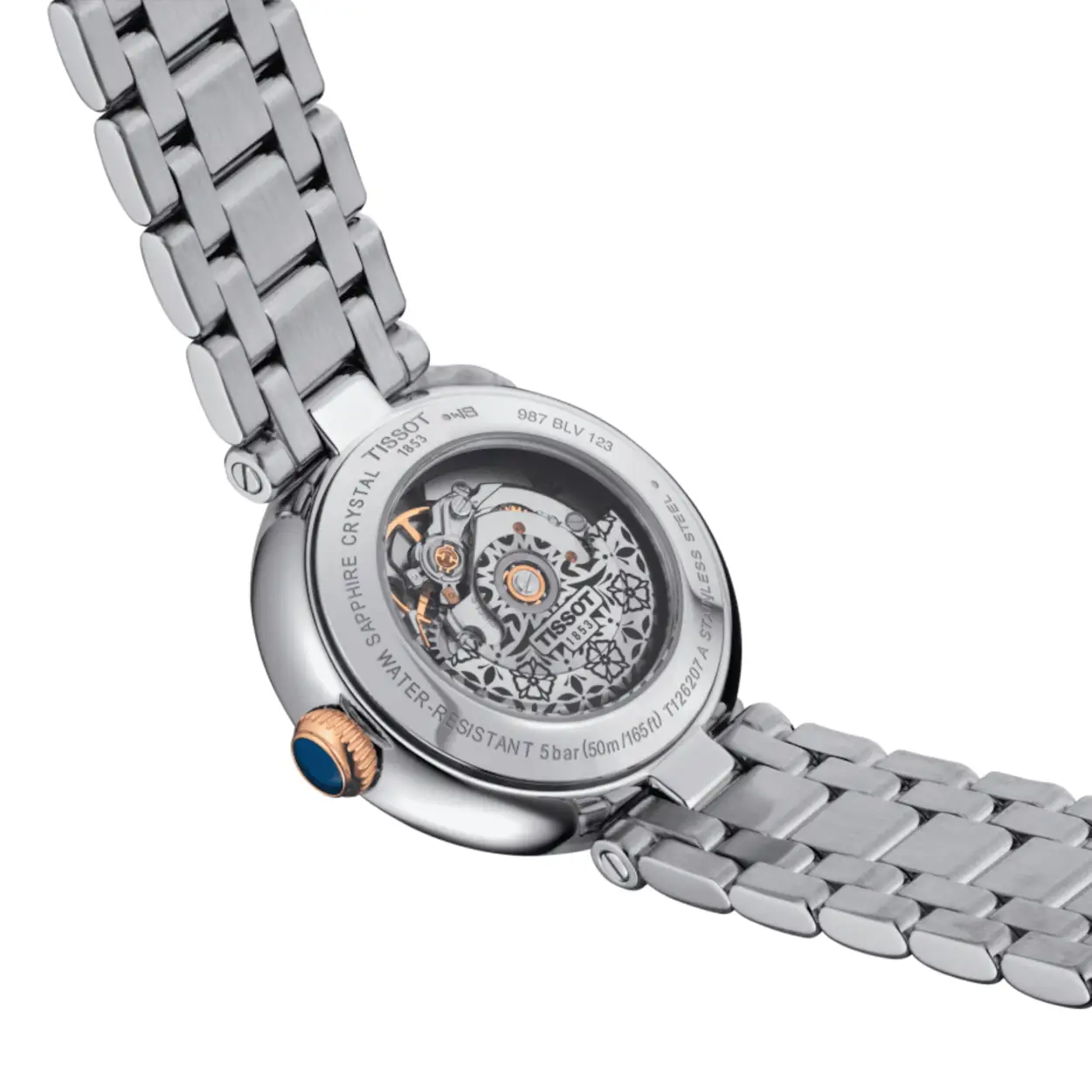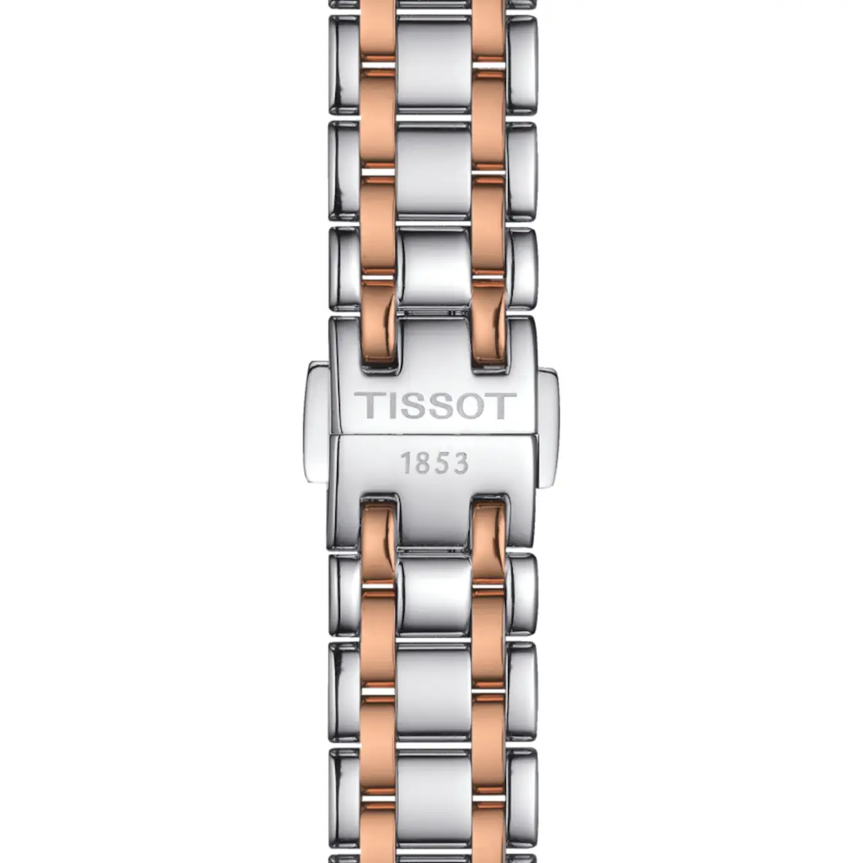 De Tissot Bellissima Small Lady maakt indruk met zijn elegante design en mooie details. Het horloge heeft een Swiss made quartz uurwerk en krasvast saffierglas met Romeinse cijfers en datumaanduiding. Dit model heeft een witte wijzerplaat en een 316L edelstalen bi-color kast en band met vlindersluiting met pushers.