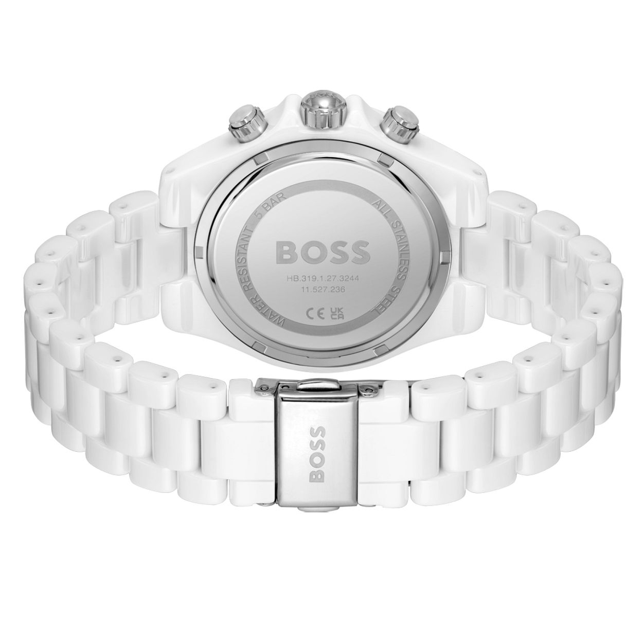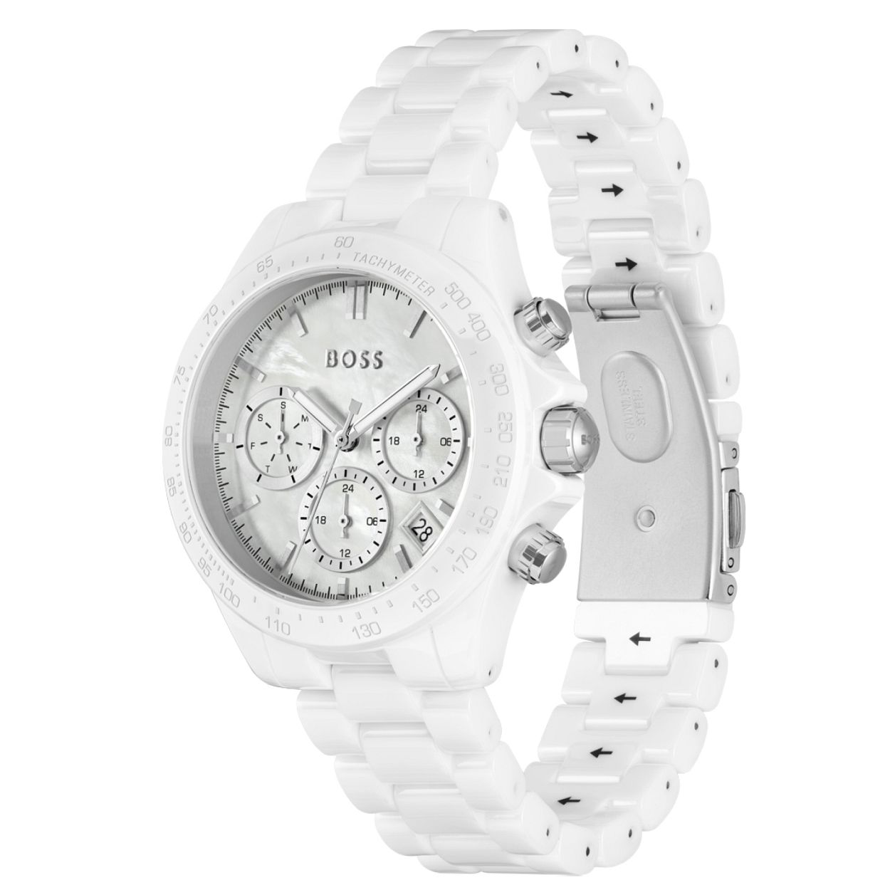 Dit BOSS dameshorloge uit de Novia ceramic serie met artikelnr. HB1502630 is een stijlvol horloge voor de vrouw die zich graag onderscheidt. Het horloge heeft een witte kast van keramiek met een witte bezel met daarop een tachymeter. Op de zilverwitte wijzerplaat zijn de dag datum en 24-uursaanduiding duidelijk zichtbaar. De wijzers zijn ingelegd met lumibrite waardoor deze goed zichtbaar zijn. Aan het horloge zit een witte keramiek schakelband met klepsluiting. Het BOSS Novia dameshorloge heeft een doorsnee van 38mm een mineraalglas en is 5 ATM.