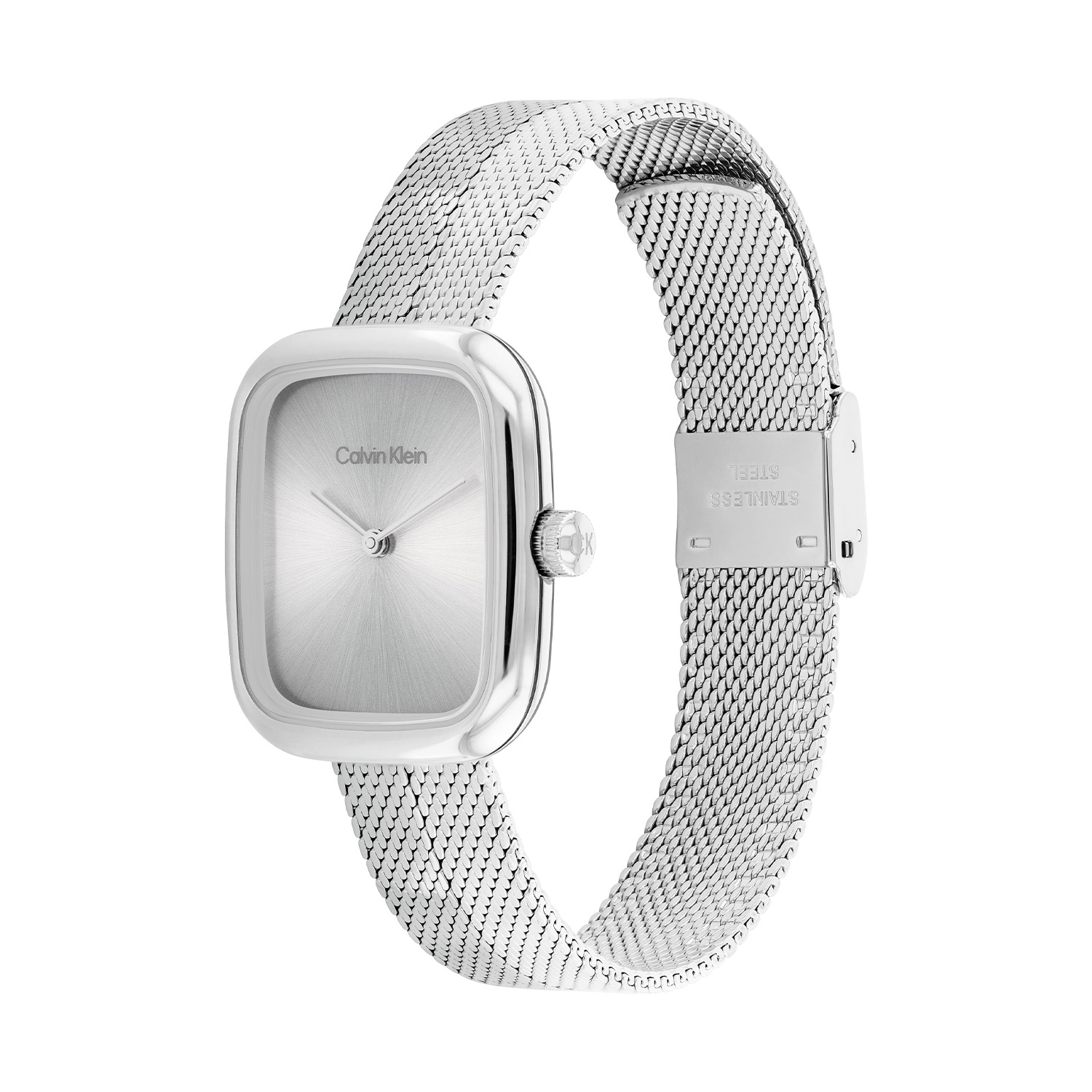 Dit Calvin Klein dameshorloge met nr CK25100098 is een klassiek ontwerp. De stijlvolle rechte stalen kast heeft een gladde bezel en een zilverkleurige sunray wijzerplaat met fijne wijzers. Strak aan de kast zit een stalen fijne gevlochten band met een drukluiting. Het elegante dameshorloge heeft een mineraalglas, een doorsnee van 30mm en is 3ATM.