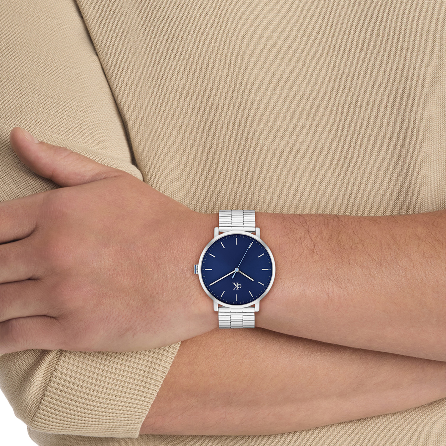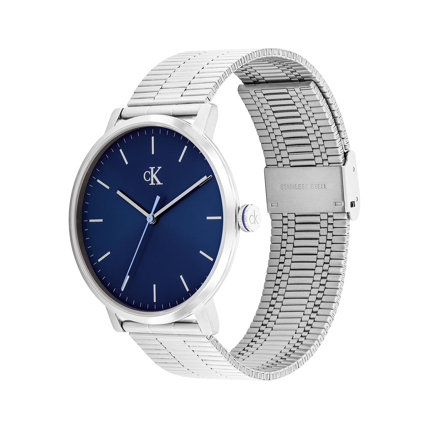 Dit Calvin Klein herenhorloge met nr CK25200548 heeft een stijlvol uiterlijk. Het stalen horloge heeft een ronde kast met een blauwe wijzerplaat met fijne wijzers en een opvallende secondewijzer. Aan de kast zit een fijne matte schakelband. Het horloge heeft een mineraalglas, een doorsnee van 42mm en is 3ATM.
