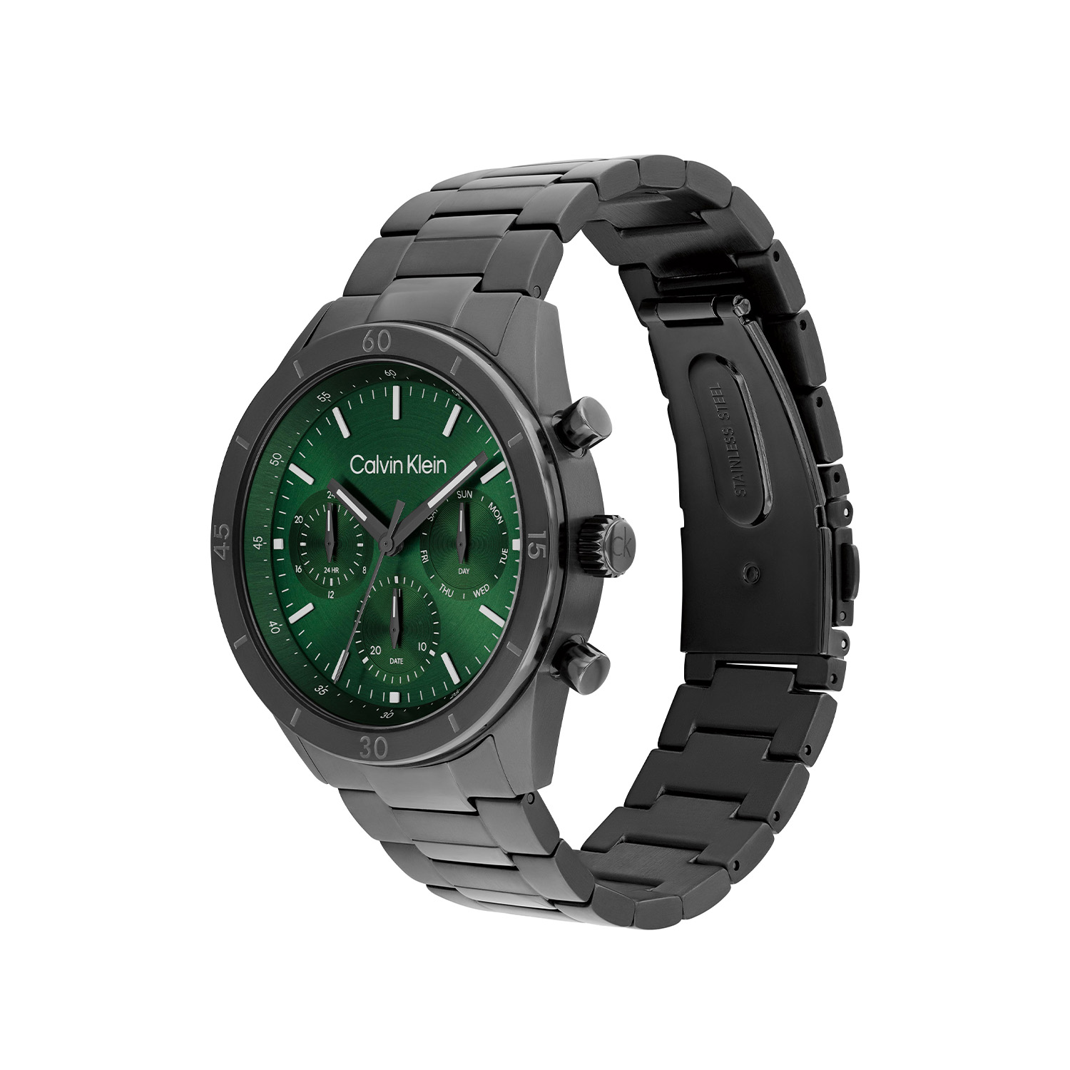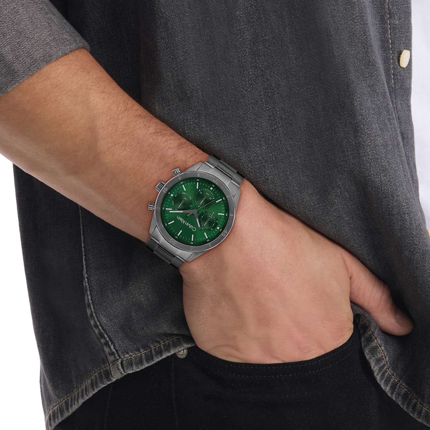 Dit Calvin Klein herenhorloge met nr CK25200561 heeft een stoer uiterlijk. Het stalen gunmetal horloge heeft een ronde kast met een groene wijzerplaat met dag, datum en 24-uursaanduiding. Aan de kast zit een stalen gunmetal schakelband. Het horloge heeft een mineraalglas, een doorsnee van 43mm en is 3ATM.