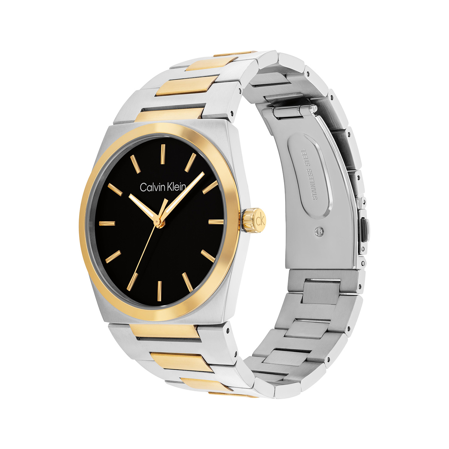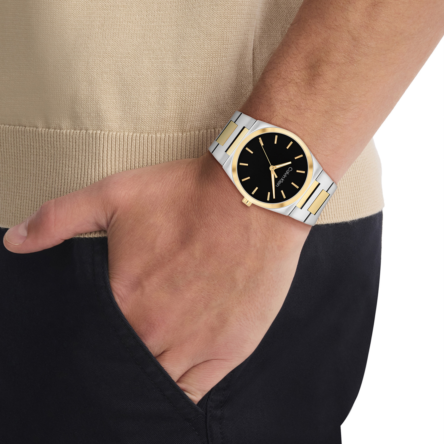 Dit Calvin Klein herenhorloge met nr CK25200544 heeft een stijlvol uiterlijk. Het stalen horloge heeft een ronde kast met een zwarte wijzerplaat met fijne wijzers ingelegd met lumibrite. Aan de kast zit een verfijnde bicolor schakelband. Het horloge heeft een mineraalglas, een doorsnee van 40mm en is 3ATM.