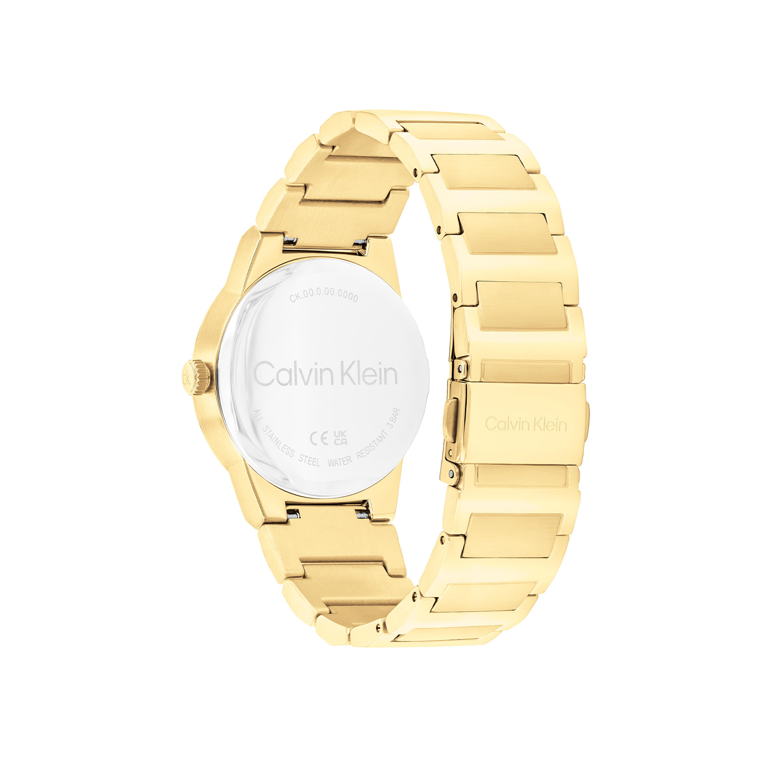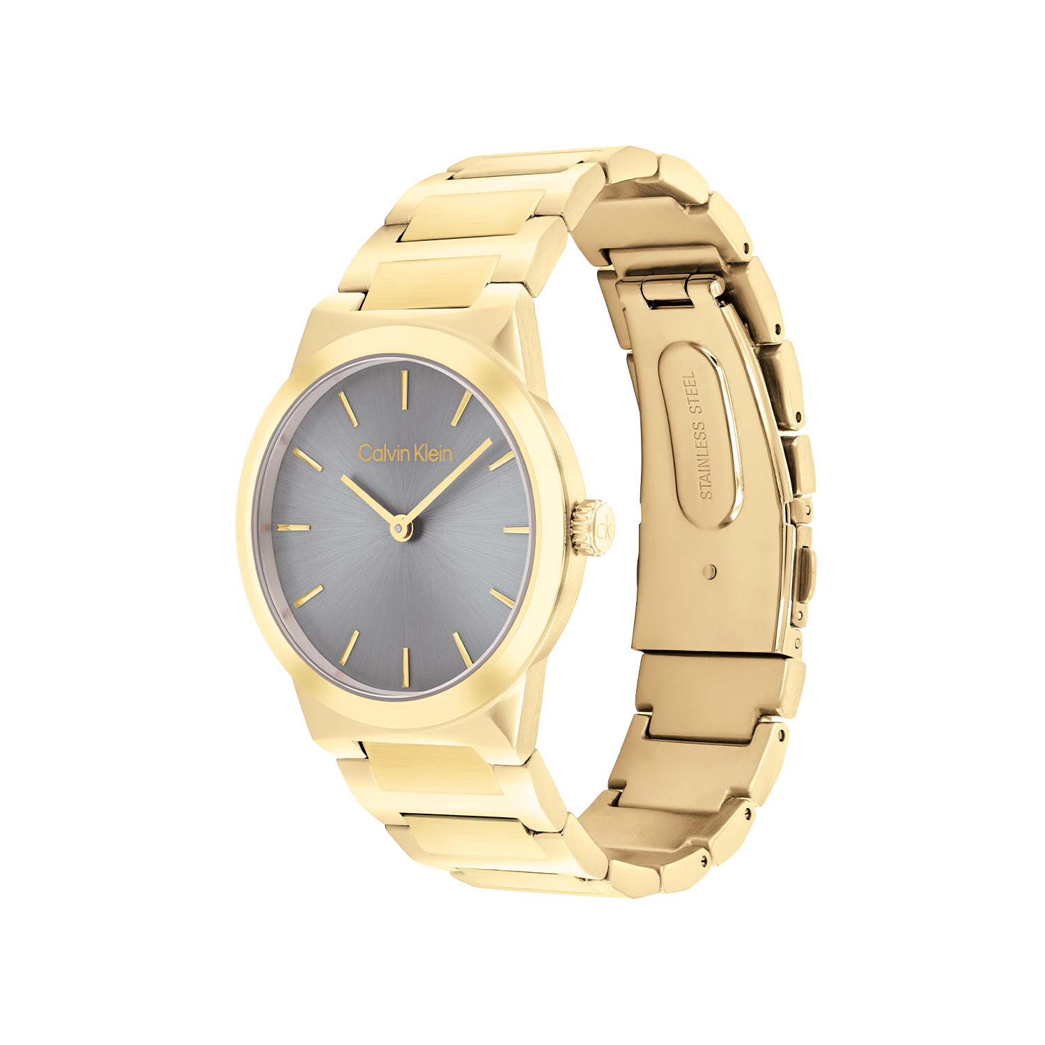Dit Calvin Klein dameshorloge met nr CK25100082 is een tijdloos ontwerp. De stijlvolle ronde stalen goudkleurige kast heeft een gladde bezel en een grijze sunray wijzerplaat met fijne goudkleurige wijzers en streepjes. Strak aan de ronde kast zit een stalen goudkleurige mat glanzende schakelband met een vouwsluiting. Het elegante dameshorloge heeft een mineraalglas, een doorsnee van 36mm en is 3ATM.