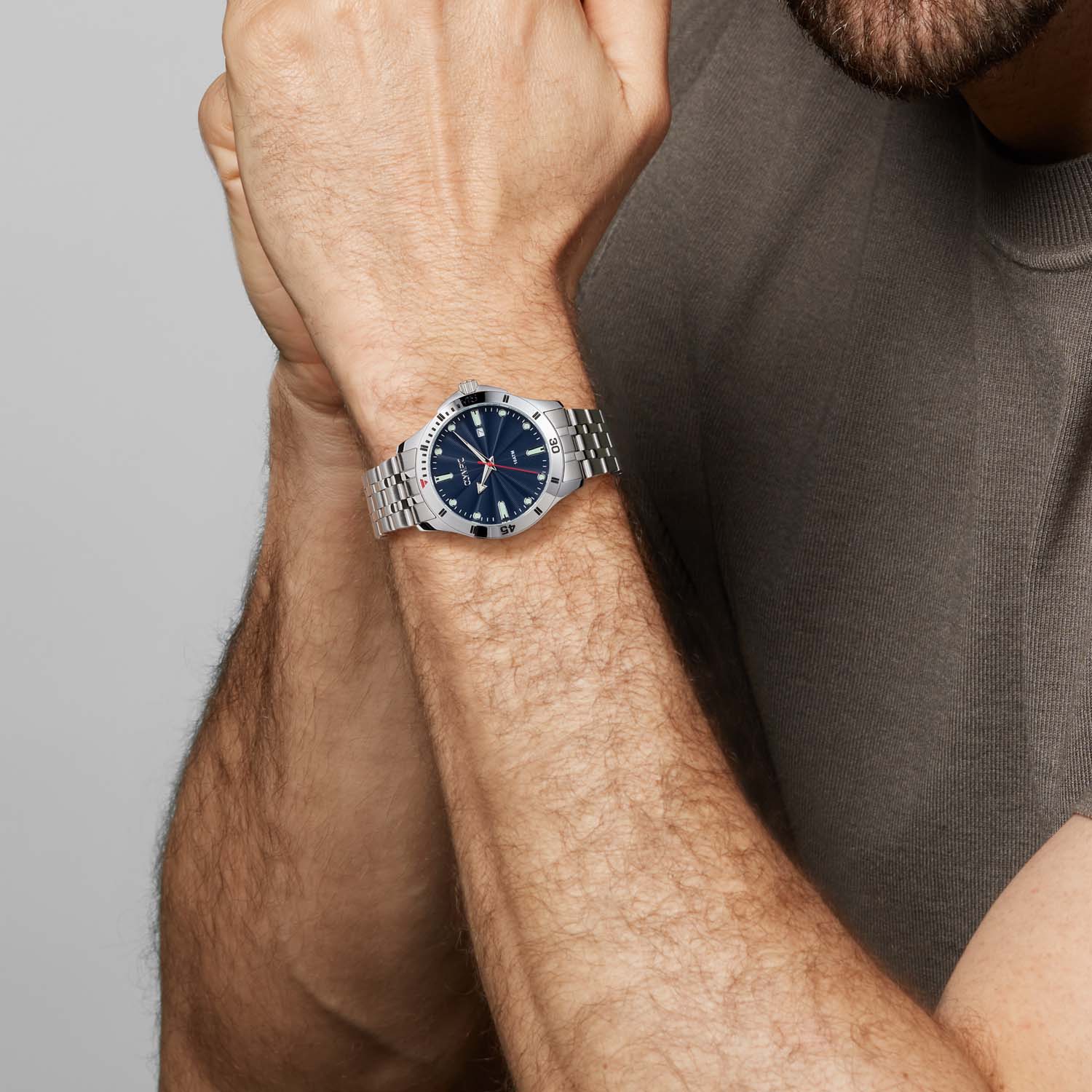 Dit unieke Olympic horloge met artikelnummer: OL72HSS406 is een herenhorloge met een classic sportieve uitstraling. Het horloge heeft een ronde stalen kast met een blauwe wijzerplaat met een datum, witte strepen en stippen ingelegd met lumibrite. Aan de kast zit een stalen schakelband met vouwsluiting. Het horloge heeft een mineraalglas, een doorsnee van 41mm en is 10ATM.