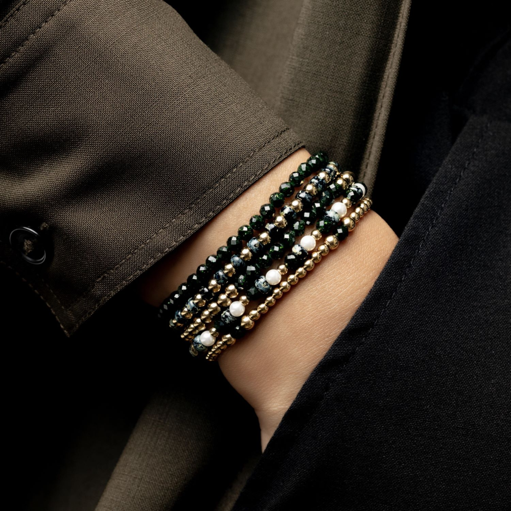 Edelstenen bead armband, handgemaakt van 4mm stenen (Zandsteen, schelp parels, Glas Rocailles, goudkleurige stenen) met een verguld edelstalen sluiting. Het Rebel & Rose sieraad is makkelijk te combineren met onze andere kralenarmbanden.