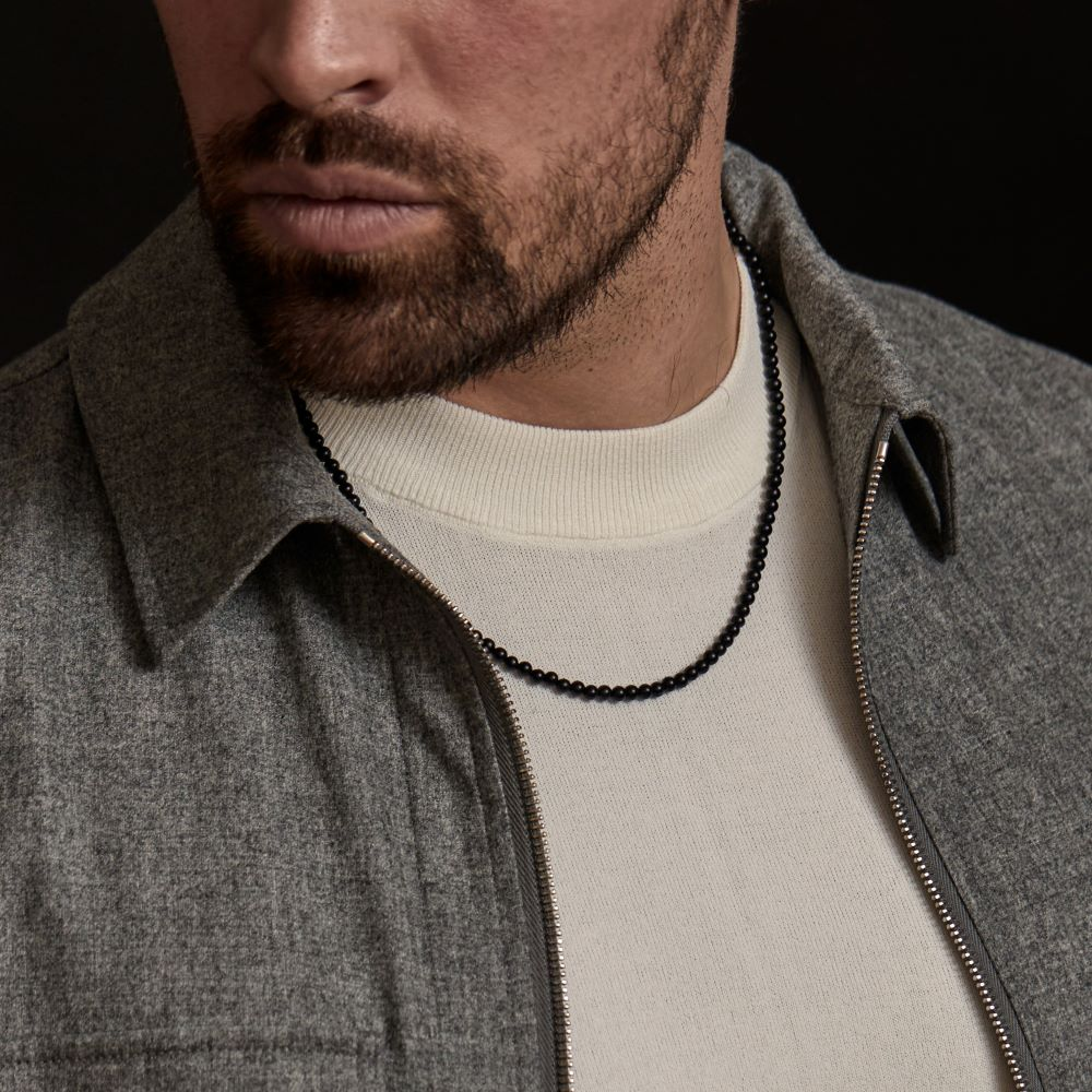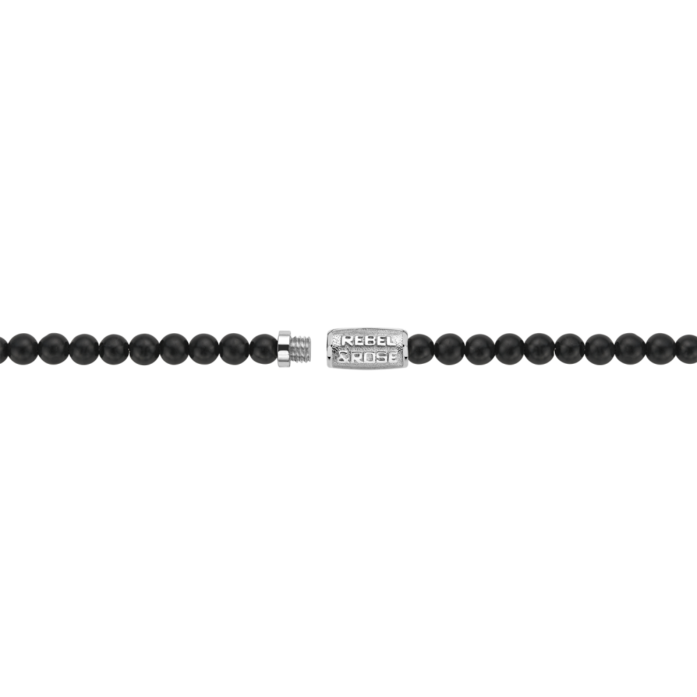 Bead ketting handgemaakt van 4mm mat zwarte Onyx stenen met een edelstalen schroefsluiting. Het Rebel & Rose sieraad is makkelijk te combineren met zilveren, leren of kralenarmbanden.