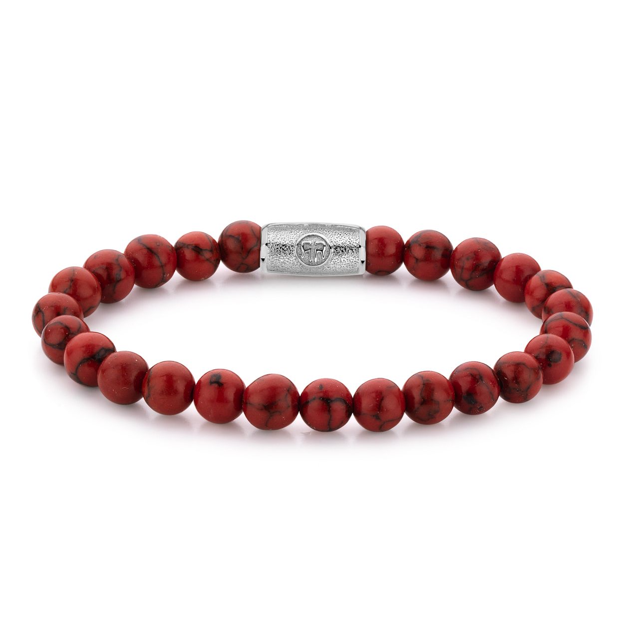 Edelstenen bead armband, handgemaakt van 8mm Howliet Red stenen met een zilverkleurige stalen sluiting. Het Rebel & Rose sieraad is makkelijk te combineren met andere zilveren, leren of kralenarmbanden.