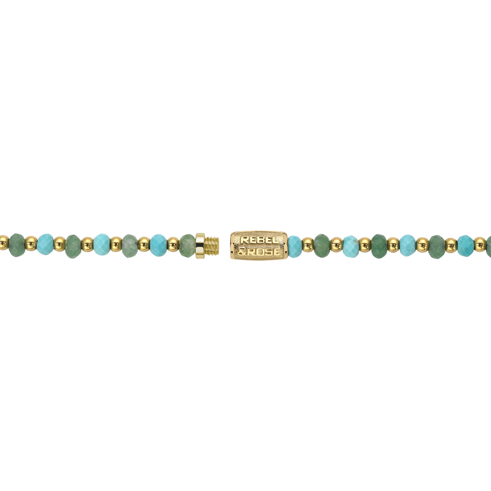 Bead ketting, handgemaakt van 3 mm goudkleurig  edelstalen ballen, gefaceteerde Turquoise stenen, en gefaceteerde groene Aventurijn stenen, met een goudkleurig edelstalen schroefsluiting. Het Rebel & Rose sieraad is makkelijk te combineren met zilveren, leren of kralenarmbanden.
