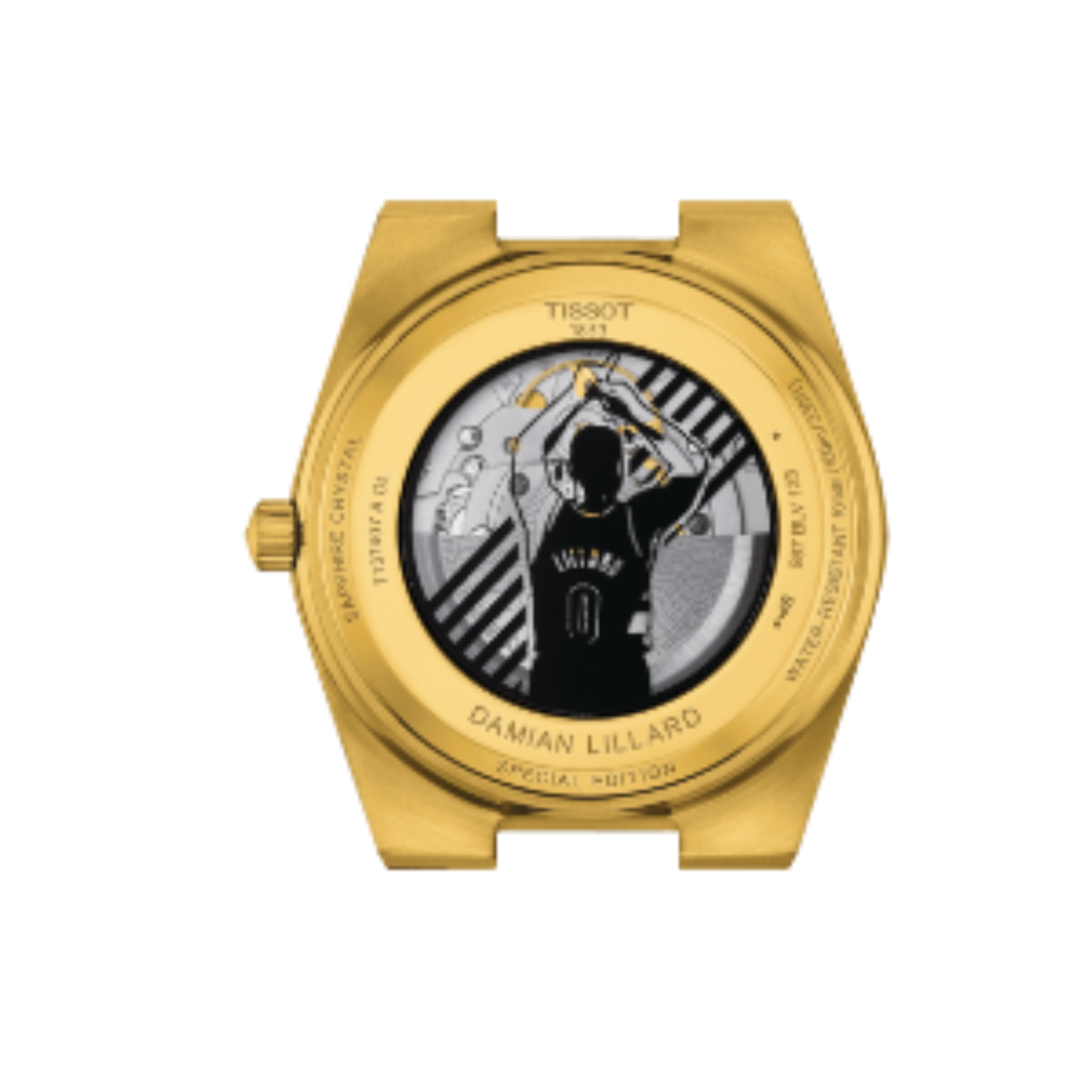 Dit speciale editie-horloge combineert de bekende kenmerken van de PRX Powermatic 80 met unieke elementen die de persoonlijkheid en carrière van Lillard weerspiegelen. Dit uurwerk is gebaseerd op de gouden PVD-modelvariant en heeft een opvallende zwarte wijzerplaat met het cijfer '0' in reliëf, een knipoog naar het rugnummer van Lillard. Op de secondewijzer staat het monogram van Damian, een subtiele maar betekenisvolle verandering. Aan de andere kant van het horloge biedt de transparante achterkant van de kast een uniek beeld: het beroemde 'Dame Time'-feest. Dit element voegt een laag van diepte en verhaal toe aan het horloge. De rand van het horloge onthult meer persoonlijke details, waarbij elk kwadrant een deel van Lillards verhaal vertelt. 'DAME' en 'TIME' sieren respectievelijk de linker- en rechterbovenhoek, synoniem met Lillards naam en clutch-prestaties op het veld. De rechteronderhoek, gemarkeerd met 'DDKK', is een oprecht eerbetoon aan zijn familie: Damian, Damian Lamonte Ollie, Kali Emma Lee en Kalii Laheem. In de linkerbenedenhoek staat stoutmoedig 'YKWTII', een acroniem voor 'You Know What Time It Is', wat het toneel vormt voor die iconische 'Dame Time'-momenten.
