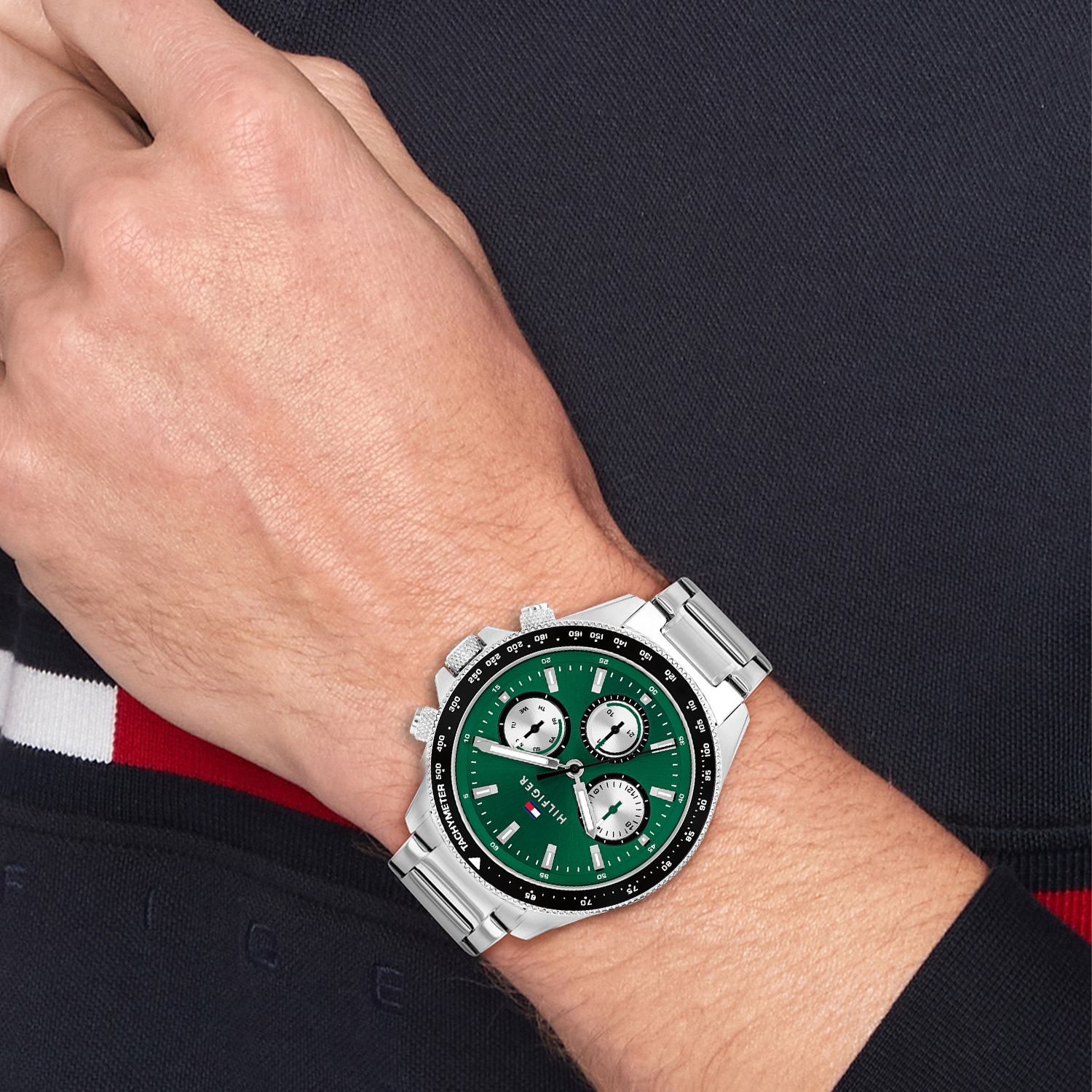 Dit specifieke horloge van Tommy Hilfiger uit de Clark serie met artikelnr: TH1792211 is een sportief herenhorloge die niet in je collectie mag ontbreken. Het stalen herenhorloge heeft een ronde kast met een aluminium bezel met tachymeter en een groene wijzerplaat met een dag, datum en 24-uursaanduiding. Aan de kast zit een stalen schakelband met een vouwsluiting. Het horloge heeft een mineraalglas, een doorsnee van 44mm en is 5ATM.