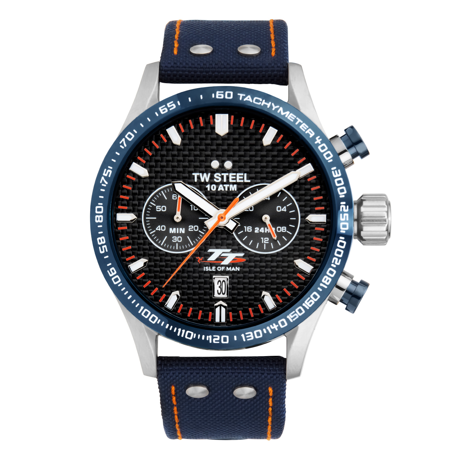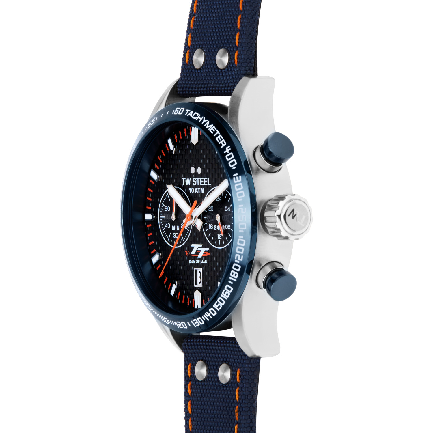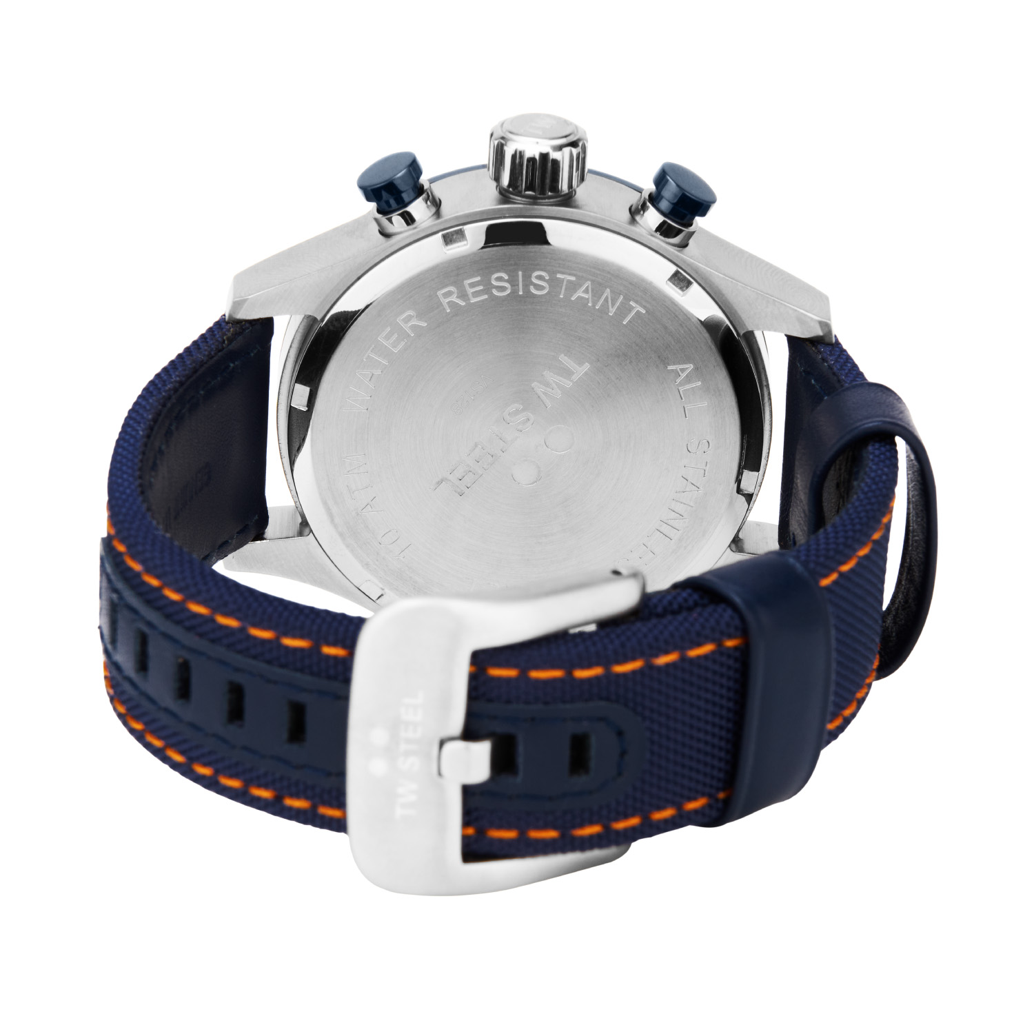 Dit is een herenhorloge van het merk TW Steel uit de serie Volante. Met een horlogekast gemaakt van staal en een blauwe band van textiel.